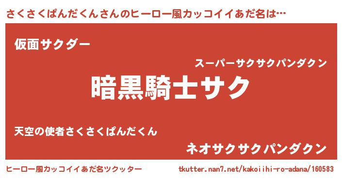 | 男性向けラノベタイトル風あだ名 | 『ダンジョンにさくさくぱんだくんを求めるのは間違っているだろうか』 |