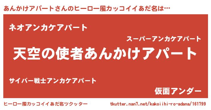 | 男性向けラノベタイトル風あだ名 | 『うちのあんかけアパートが世界を掌握している!』 |