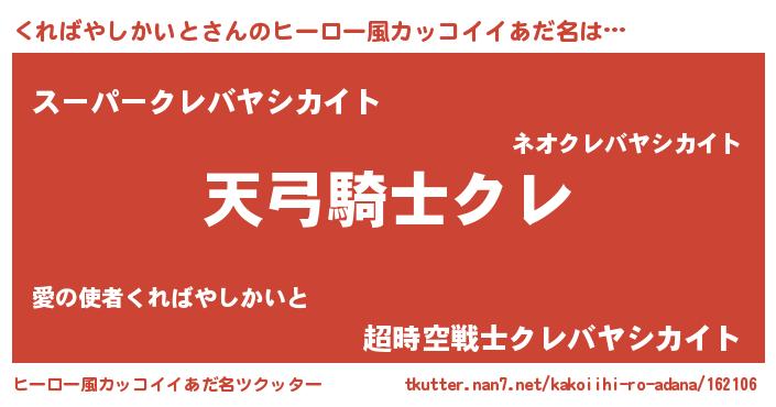 | 男性向けラノベタイトル風あだ名 | 『くればやしかいとの嫁は女の子じゃないと思った?』 |