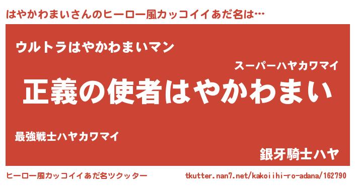 | 男性向けラノベタイトル風あだ名 | 『おまえをオタクにしてやるから、俺をはやかわまいにしてくれ! 』 |