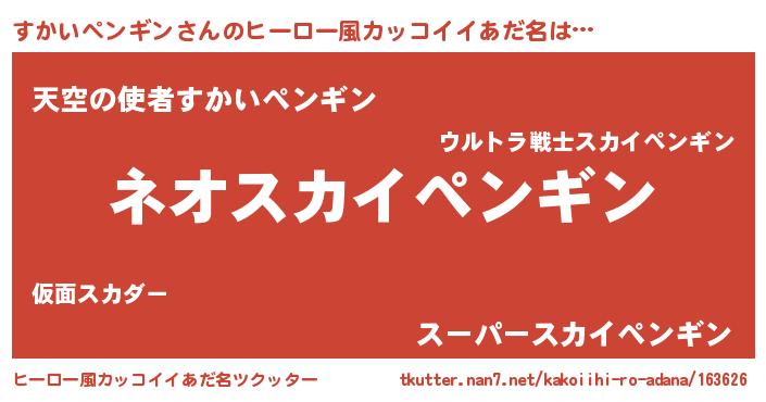 | 胡散臭い通販商品みたいなあだ名 | 『絶対に幸福をもたらす水素水…その名も「すかいペンギン」』 |