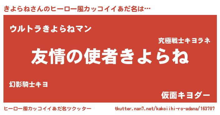 | 男性向けラノベタイトル風あだ名 | 『おまえをオタクにしてやるから、俺をきよらねにしてくれ! 』 |
