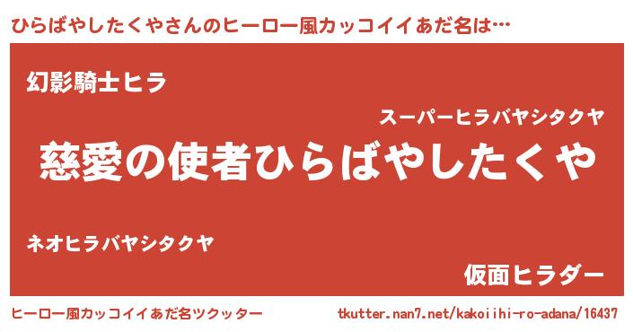 | 男性向けラノベタイトル風あだ名 | 『ひらばやしたくや~年齢イコール彼女いない歴の魔法使い~』 |