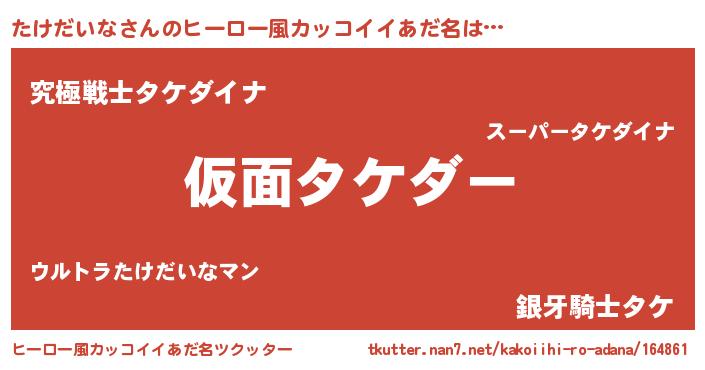 | 男性向けラノベタイトル風あだ名 | 『この素晴らしい世界にたけだいなを!』 |