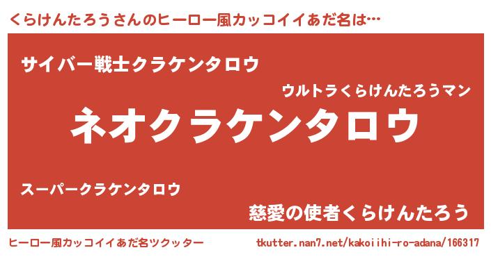 | 胡散臭い通販商品みたいなあだ名 | 『絶対に幸福をもたらす水素水…その名も「くらけんたろう」』 |