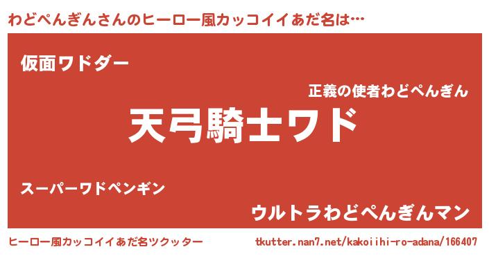 | 男性向けラノベタイトル風あだ名 | 『わどぺんぎんの嫁は女の子じゃないと思った?』 |