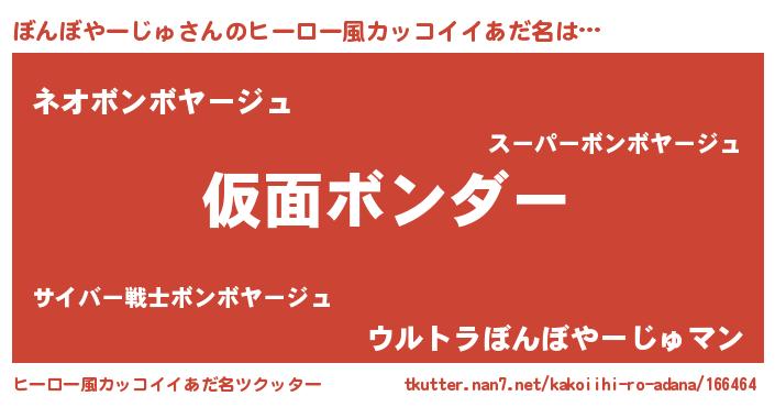 | 胡散臭い通販商品みたいなあだ名 | 『あなたにだけ特別に提供する100年もののヴィンテージワイン…その名も「ぼんぼやーじゅ」』 |