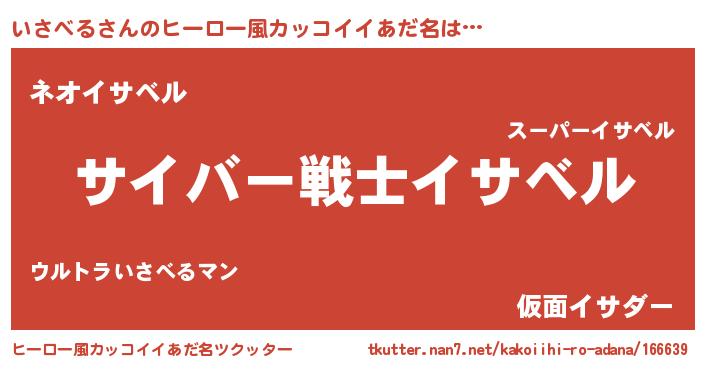 | 男性向けラノベタイトル風あだ名 | 『Re:いさべるから始める異世界生活』 |