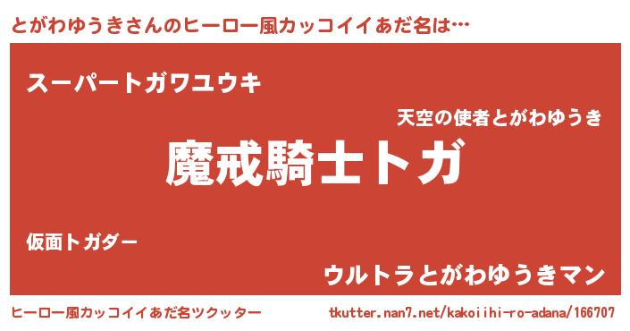 | ポケモン風あだ名 | 『ヒトガワユウキ』『トガキング』 |