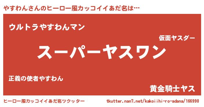 | 男性向けラノベタイトル風あだ名 | 『やすわん~年齢イコール彼女いない歴の魔法使い~』 |