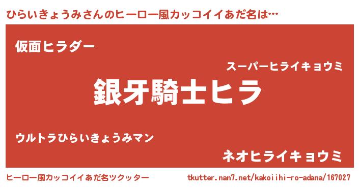 | 男性向けラノベタイトル風あだ名 | 『ひらいきょうみの嫁は女の子じゃないと思った?』 |