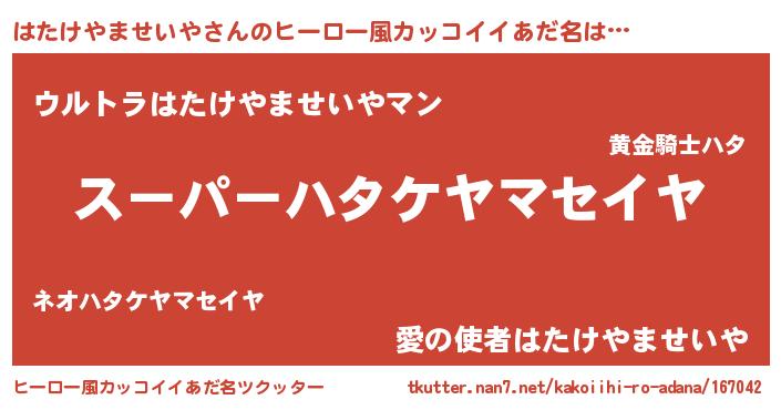 | 男性向けラノベタイトル風あだ名 | 『はたけやませいやの憂鬱』 |