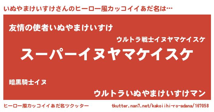 | 女子向けラノベタイトル風あだ名 | 『(仮)いぬやまけいすけのやんごとなき事情』 |