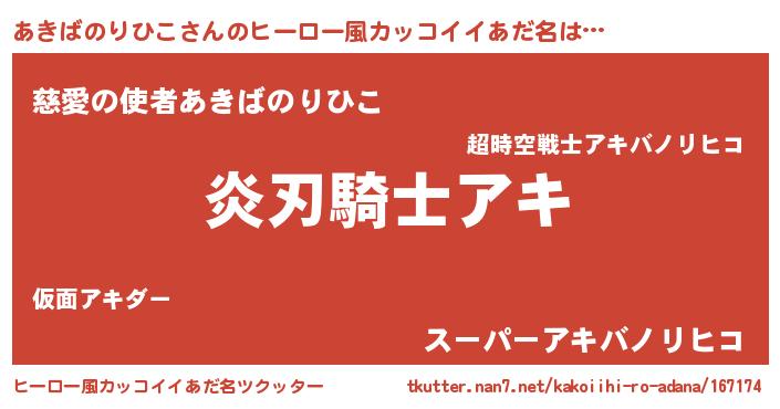 | 男性向けラノベタイトル風あだ名 | 『あきばのりひこの嫁は女の子じゃないと思った?』 |