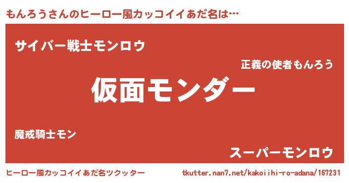 | 男性向けラノベタイトル風あだ名 | 『もんろう~年齢イコール彼女いない歴の魔法使い~』 |