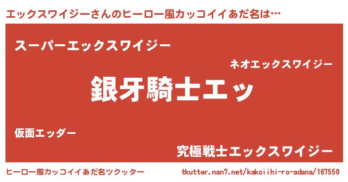 | 男性向けラノベタイトル風あだ名 | 『エックスワイジーの嫁は女の子じゃないと思った?』 |