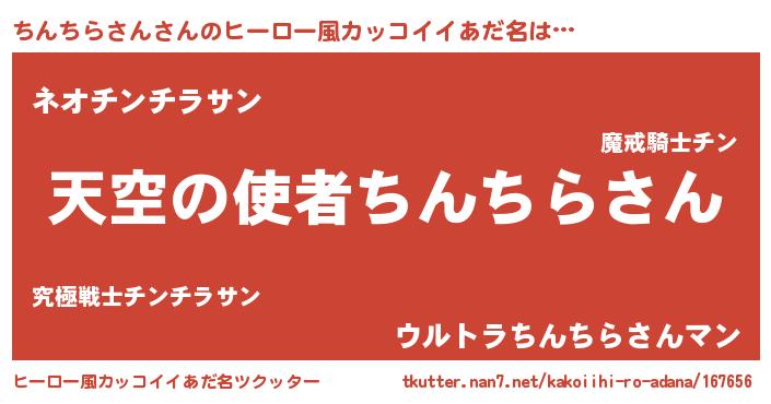 | 男性向けラノベタイトル風あだ名 | 『ちんちらさんに滅ぼされるだけの簡単なお仕事です』 |