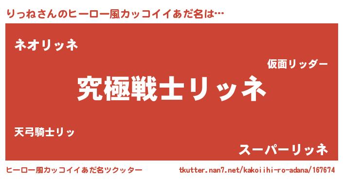 | 男性向けラノベタイトル風あだ名 | 『Re:りっねから始める異世界生活』 |