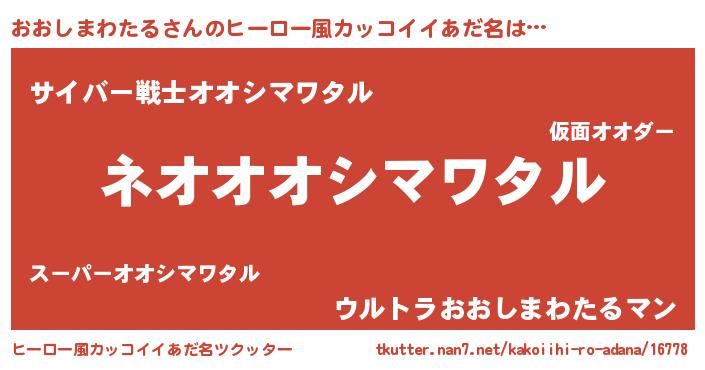 | 男性向けラノベタイトル風あだ名 | 『おおしまわたる~年齢イコール彼女いない歴の魔法使い~』 |