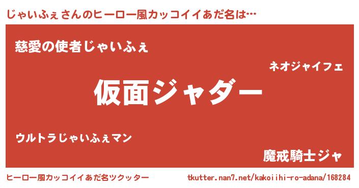 | 女子向けラノベタイトル風あだ名 | 『じゃいふぇの玉の輿計画!』 |