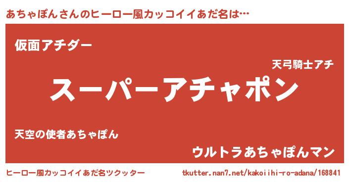 | 男性向けラノベタイトル風あだ名 | 『あちゃぽん~年齢イコール彼女いない歴の魔法使い~』 |