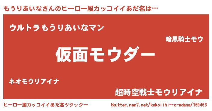 | 男性向けラノベタイトル風あだ名 | 『この素晴らしい世界にもうりあいなを!』 |