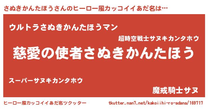 | 男性向けラノベタイトル風あだ名 | 『さぬきかんたほうに滅ぼされるだけの簡単なお仕事です』 |