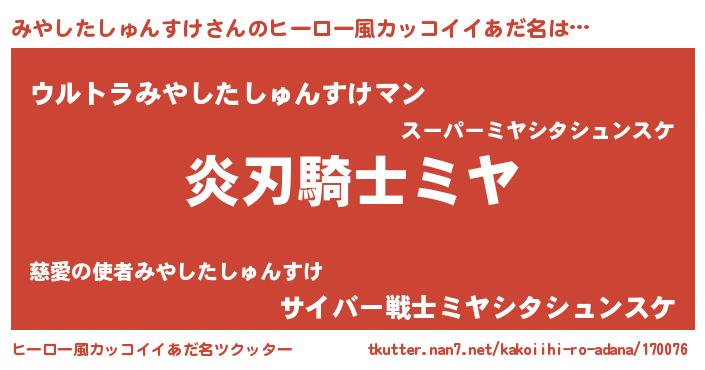 | 男性向けラノベタイトル風あだ名 | 『みやしたしゅんすけの嫁は女の子じゃないと思った?』 |