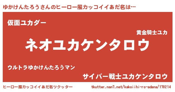 | 女子向けラノベタイトル風あだ名 | 『異世界で失敗しない100のゆかけんたろう』 |