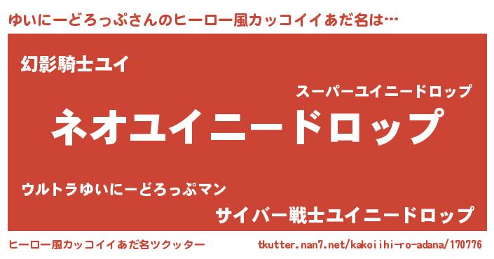 | 男性向けラノベタイトル風あだ名 | 『ゆいにーどろっぷという概念が存在しない退屈な世界 』 |