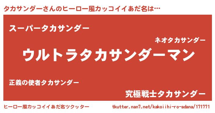 | 男性向けラノベタイトル風あだ名 | 『タカサンダー~年齢イコール彼女いない歴の魔法使い~』 |
