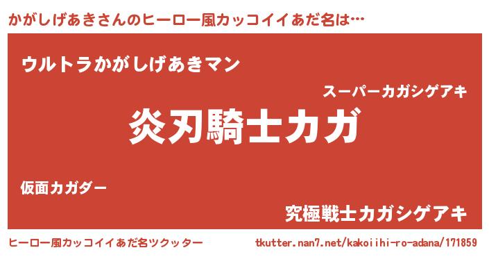 | 男性向けラノベタイトル風あだ名 | 『かがしげあき~年齢イコール彼女いない歴の魔法使い~』 |