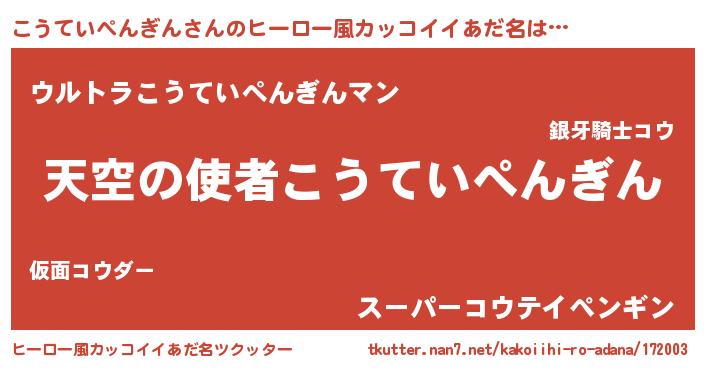 | 男性向けラノベタイトル風あだ名 | 『ノーゲーム・ノーコウテイペンギン』 |
