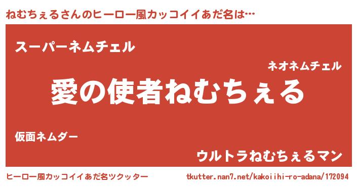 | 男性向けラノベタイトル風あだ名 | 『おまえをオタクにしてやるから、俺をねむちぇるにしてくれ! 』 |