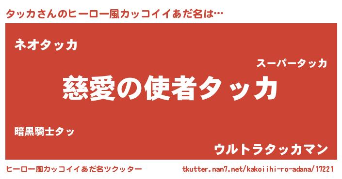 | 男性向けラノベタイトル風あだ名 | 『タッカに滅ぼされるだけの簡単なお仕事です』 |