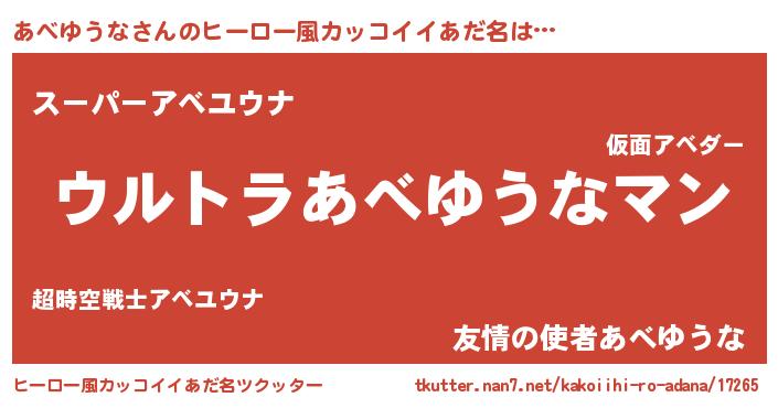 | 男性向けラノベタイトル風あだ名 | 『あべゆうな~年齢イコール彼女いない歴の魔法使い~』 |