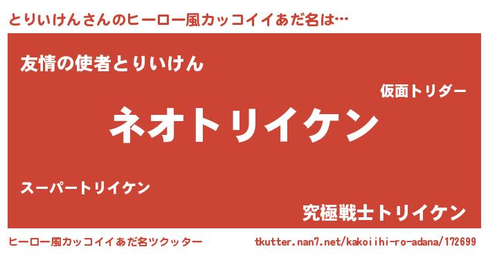 | 男性向けラノベタイトル風あだ名 | 『とりいけんという概念が存在しない退屈な世界 』 |