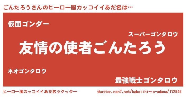| 男性向けラノベタイトル風あだ名 | 『おまえをオタクにしてやるから、俺をごんたろうにしてくれ! 』 |