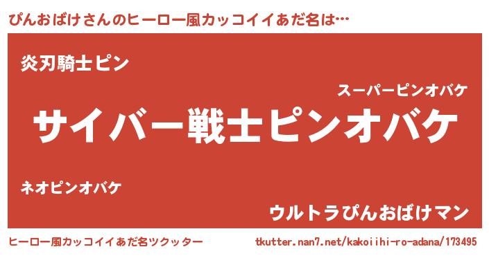 | 男性向けラノベタイトル風あだ名 | 『Re:ぴんおばけから始める異世界生活』 |
