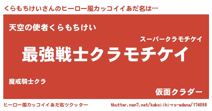| 男性向けラノベタイトル風あだ名 | 『うちのくらもちけいが世界を掌握している!』 |