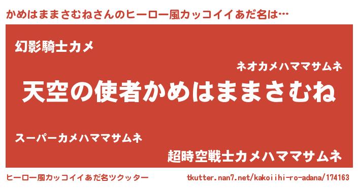 | 男性向けラノベタイトル風あだ名 | 『かめはままさむねに滅ぼされるだけの簡単なお仕事です』 |