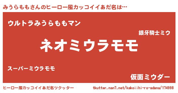 | 胡散臭い通販商品みたいなあだ名 | 『絶対に幸福をもたらす水素水…その名も「みうらもも」』 |