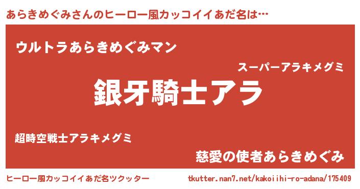 | 女子向けラノベタイトル風あだ名 | 『あらきめぐみの卵を拾いまして』 |