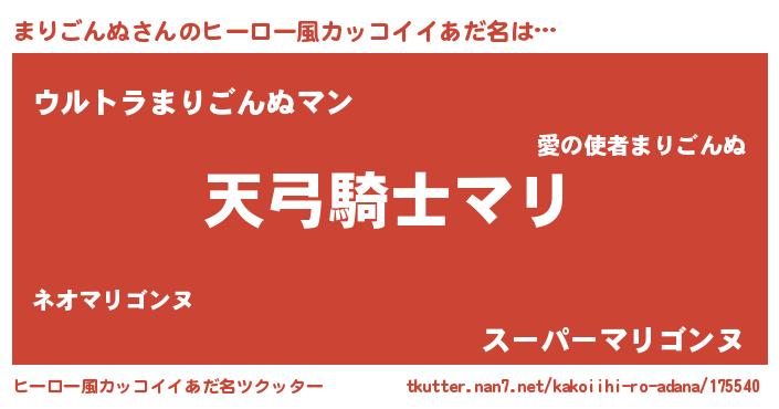 | 男性向けラノベタイトル風あだ名 | 『まりごんぬ~年齢イコール彼女いない歴の魔法使い~』 |