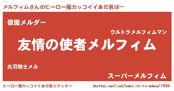 | 男性向けラノベタイトル風あだ名 | 『おまえをオタクにしてやるから、俺をメルフィムにしてくれ! 』 |