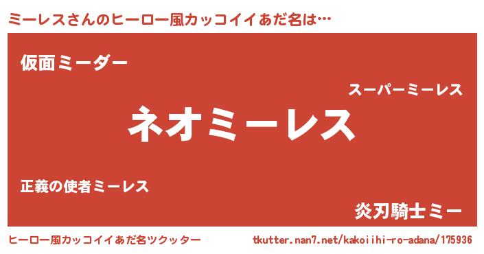 | 男性向けラノベタイトル風あだ名 | 『ミーレスという概念が存在しない退屈な世界 』 |