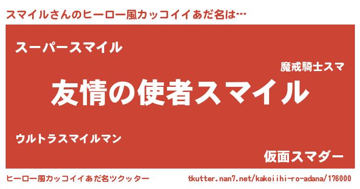 | 男性向けラノベタイトル風あだ名 | 『おまえをオタクにしてやるから、俺をスマイルにしてくれ! 』 |