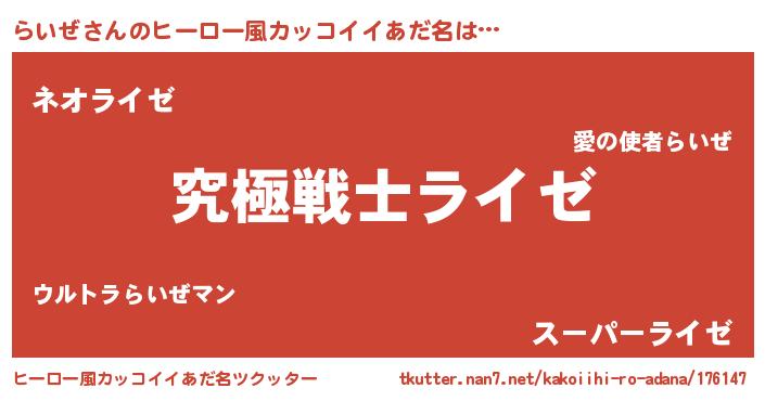 | 男性向けラノベタイトル風あだ名 | 『Re:らいぜから始める異世界生活』 |