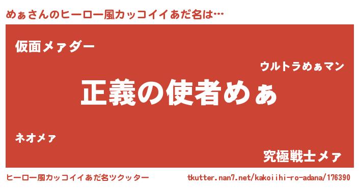 | 男性向けラノベタイトル風あだ名 | 『おまえをオタクにしてやるから、俺をめぁにしてくれ! 』 |
