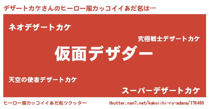 | 男性向けラノベタイトル風あだ名 | 『デザートカケ~年齢イコール彼女いない歴の魔法使い~』 |